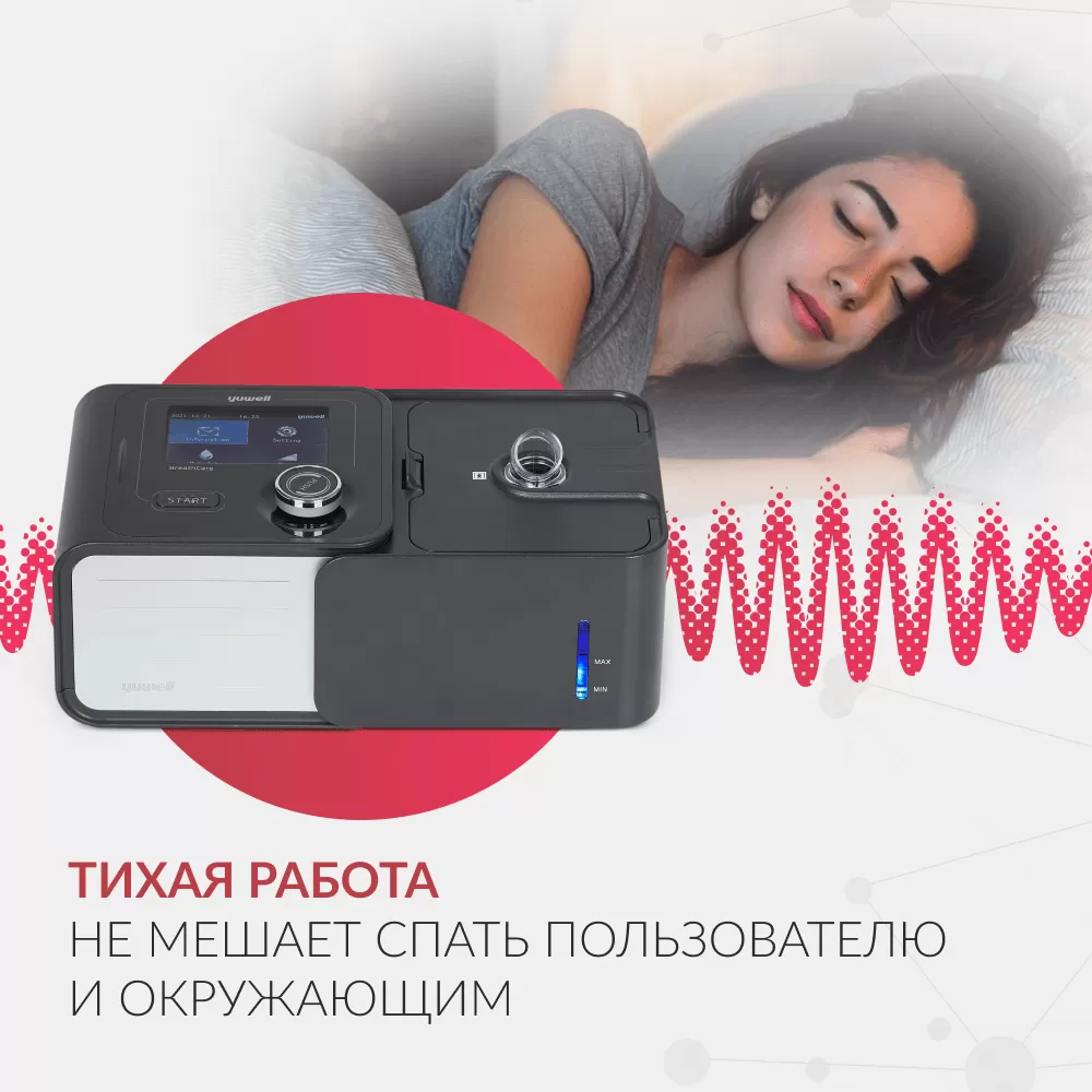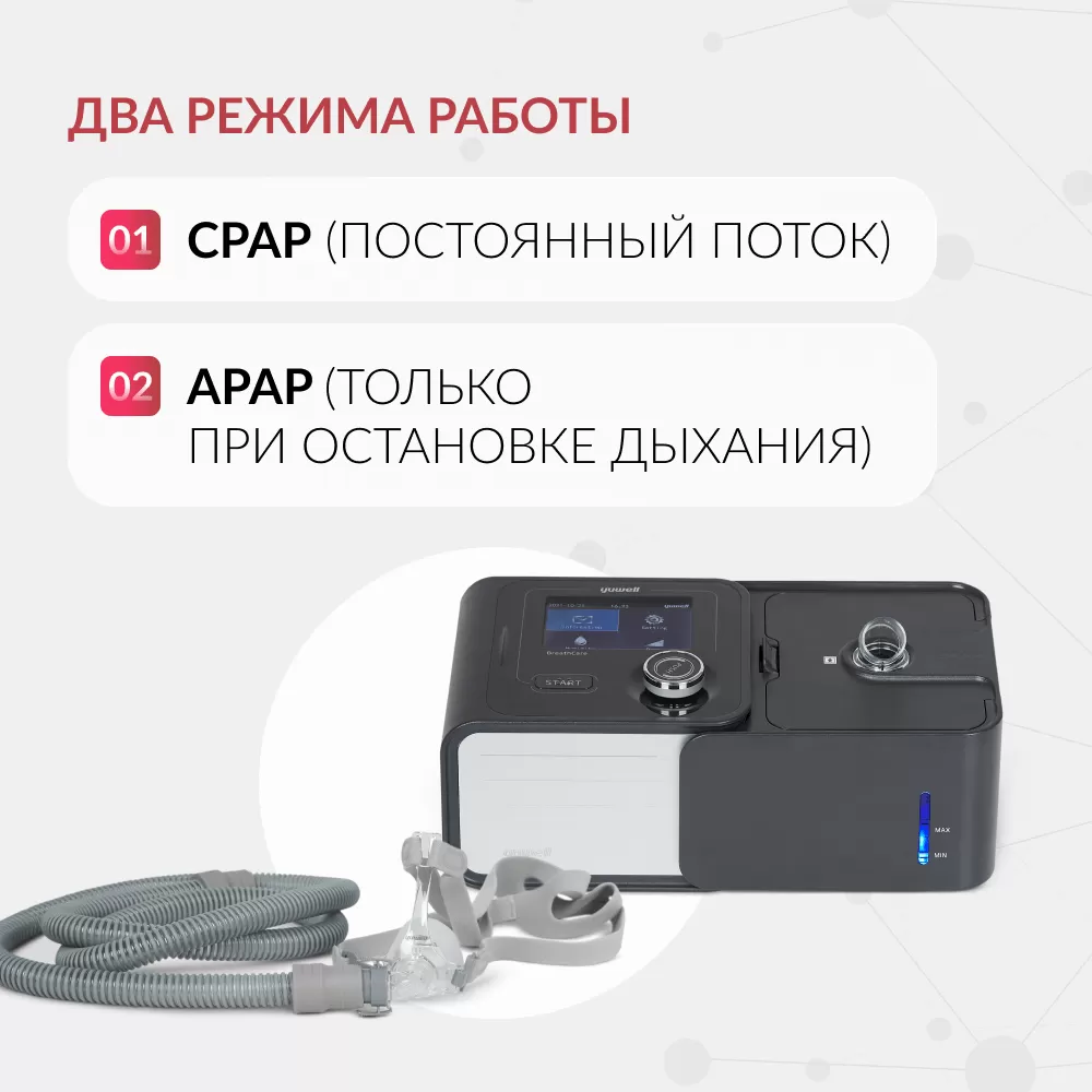 - Режимы работы. Модель поддерживает два режима работы: CPAP и APAP. В режиме CPAP создаётся постоянное положительное давление в дыхательных путях при дыхательном цикле. Режим APAP предполагает автоматическую настройку давления нагнетаемого воздуха — воздушный поток подаётся только в моменты остановки дыхания, помогая пациенту сделать вдох.