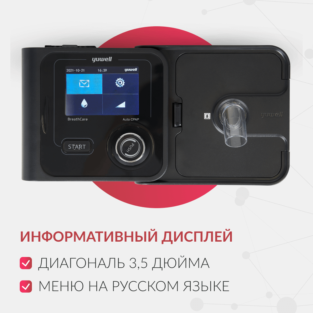- Понятное управление. На дисплей прибора выводятся все данные о терапии: индекс AHI (соотношение числа случаев апноэ и гипопноэ ко времени сна), длительность предыдущей и текущей терапии, среднее давление и скорость потока во время последнего сеанса и др. Пользователь может задать режим работы, уровень давления и влажности воздуха, включить или выключить подсветку увлажнителя, функцию автовключения и звуковую сигнализацию о неисправностях, настроить время, дату и единицы измерения давления (H2O/гПа). Всё управление осуществляется с помощью одного регулятора.