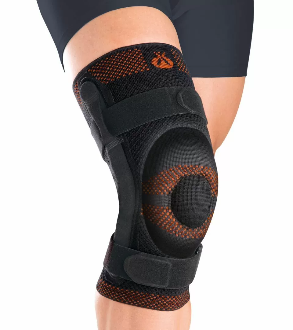 - Жесткие боковые ребра с полицентрическим шарниром предназначены для латерально-медиальной стабилизации коленного сустава, что защищает его от перегрузок.