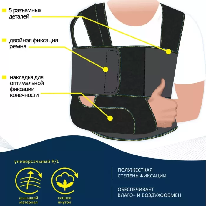 - Разъемная основа состоит из 5 деталей ─ обеспечивает оптимальную фиксацию конечности, разгружая плечевой и стабилизируя локтевой суставы.