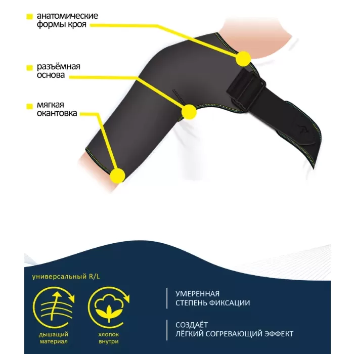 - Бандаж умеренной фиксации подходит людям любой комплекции как для реабилитации, так и для профилактики травм и воспалений плечевого сустава, создает комфорт и удобство ношения за счет «дышащего» материала и анатомической формы.