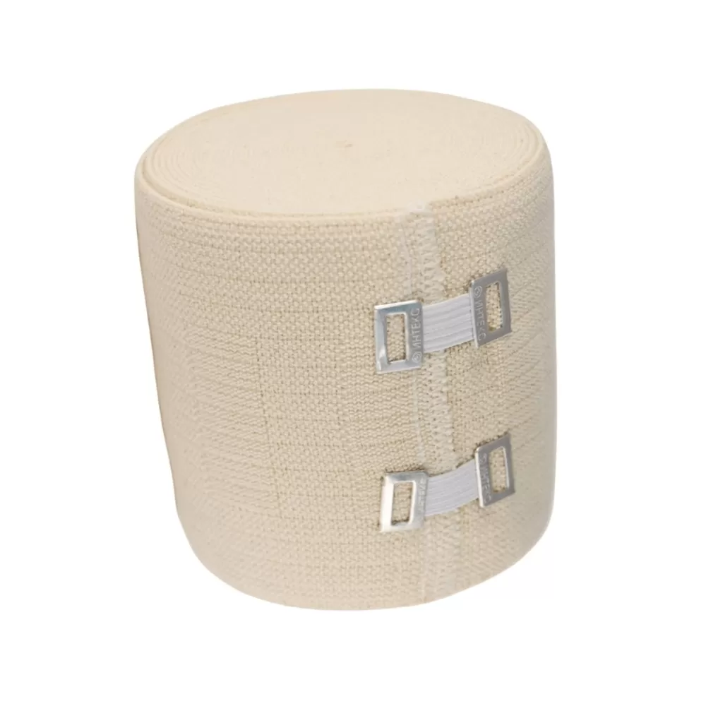 Бинт медицинский эластичный компрессионный представляет собой тканую эластичную ленту средней степени растяжимости (100% - 150%) в цвете натурального сырья. Размер: ширина 8 см, длина 5 м. Закрепляется металлическими застежками.Показания