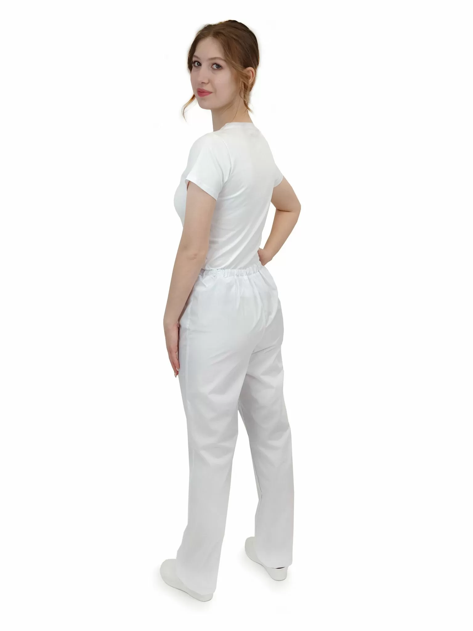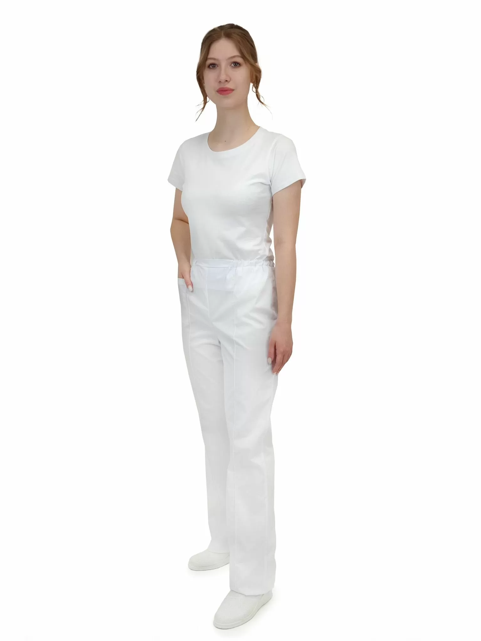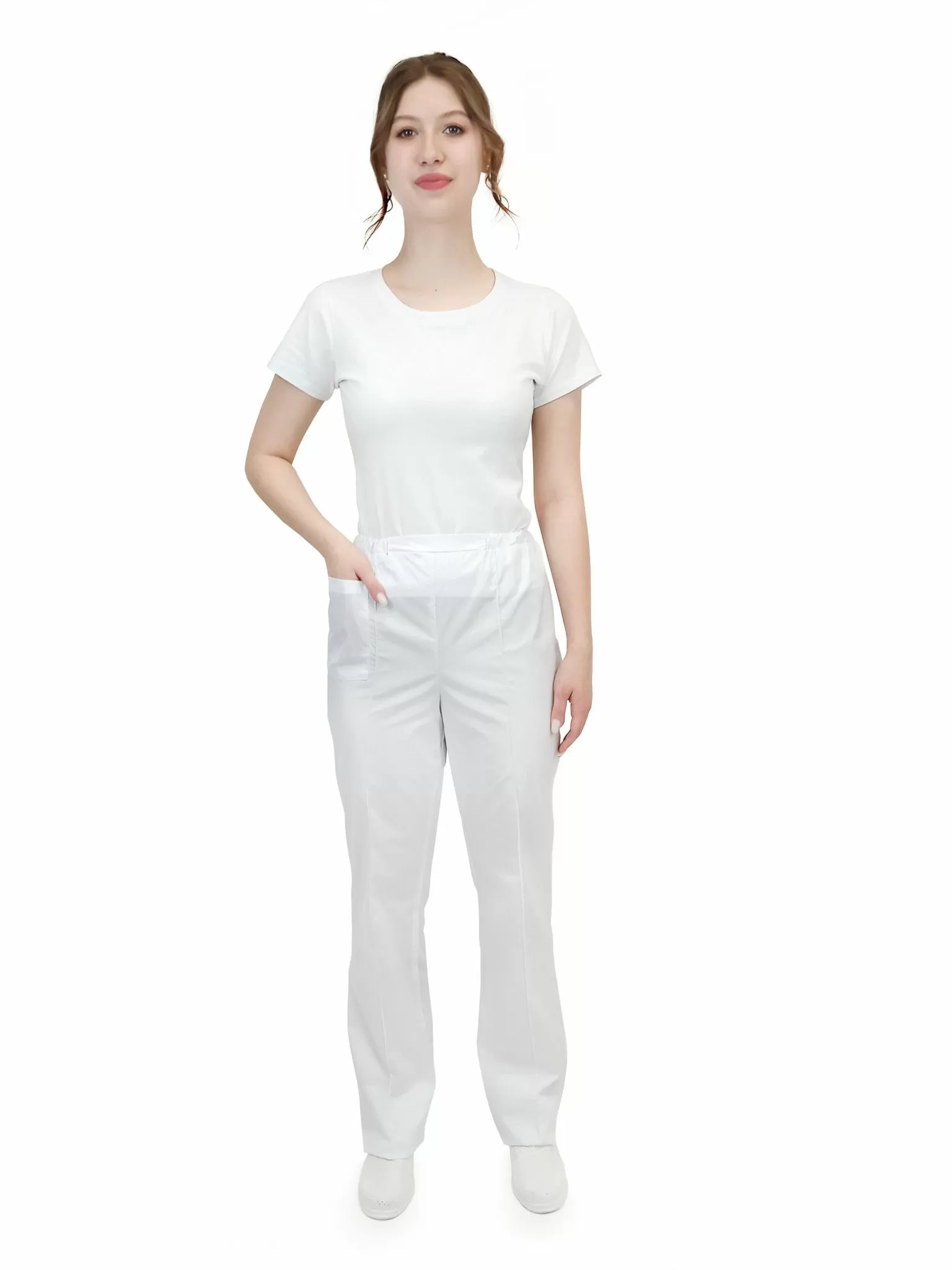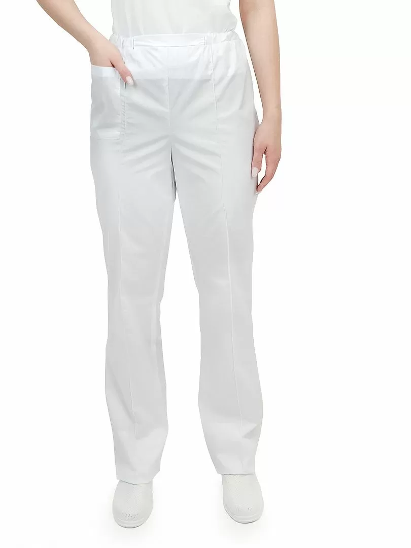 Брюки прямого силуэта, без застежки. Длинные, с накладным карманом на правой половинке. На передних половинках застрочены стрелки.