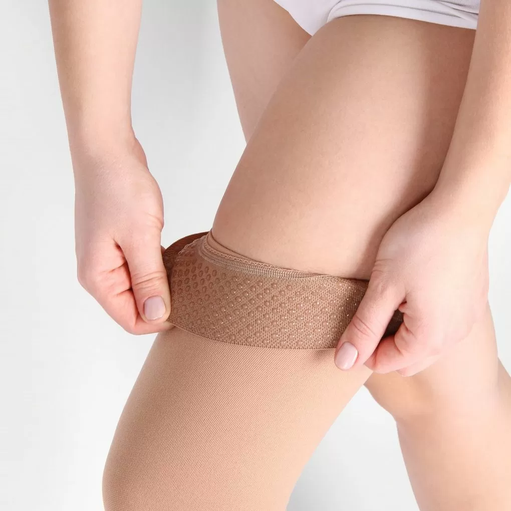 - для чулок с силиконовой лентой – не смазывать кремом или мазью ту часть ноги, куда приклеивается силиконовая лента;