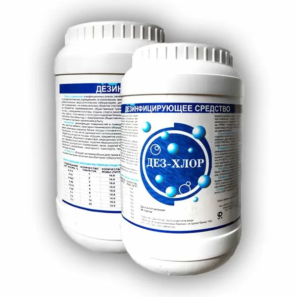 Средство «Дез-Хлор» представляет собой таблетки белого цвета с запахом хлора. В качестве действующего вещества средство содержит натриевую соль дихлоризоциануровой кислоты – 84% и функциональные добавки: адипиновая кислота, бикарбонат натрия, сульфонол. Таблетки весом 3,14–3,50 г при растворении выделяют 1,35–1,65 г активного хлора (АХ). Обладает моющим эффектом.