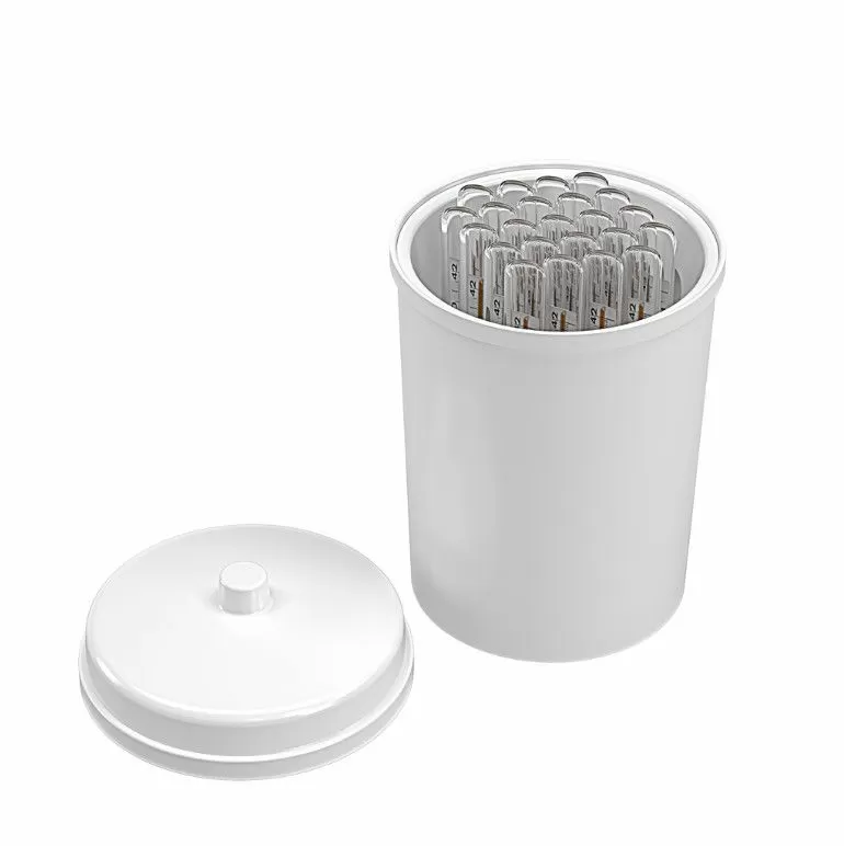 Удобная сертифицированная емкость для хранения термометров ЕХТ – это практичное изделие для любых медицинских учреждений. Обеспечивает сохранность и порядок, предотвращает утерю и повреждение оборудования. Емкость изготовлена из ударопрочного, химически стойкого, нетоксичного полистирола белого цвета, стойкого к воздействию растворов дезинфицирующих средств. Состоит из корпуса, вкладыша с ячейками и крышки. Вмещает не менее 22 термометров.
