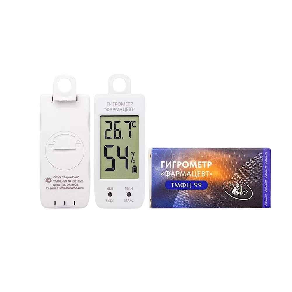 Гигрометр Фарм-Сиб ТМФЦ-99 — электронное устройство для контроля температуры и влажности воздуха в помещении. Прибор применяется в жилых и общественных зданиях, а также в учреждениях здравоохранения, образования, торговли и хранения продукции. Прибор облегчает работу специалистов при соблюдении требований, установленных Приказами Росздравнадзора № 646н, № 706н, № 9438, условий хранения и транспортировки лекарственных средств и вакцин.