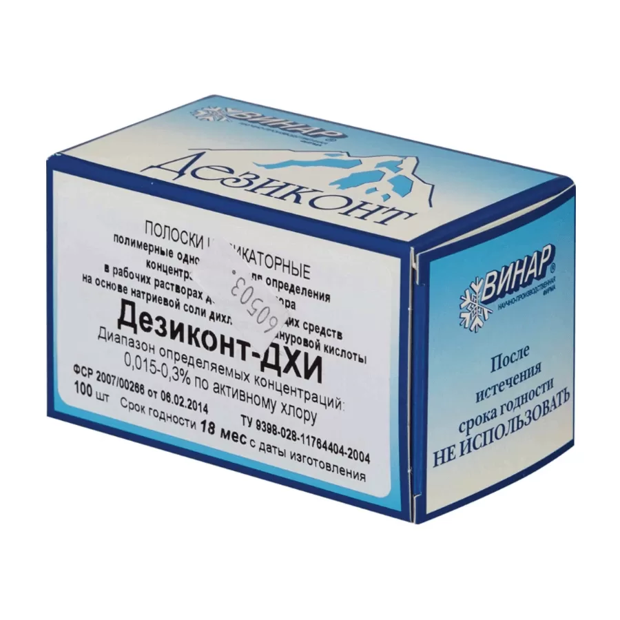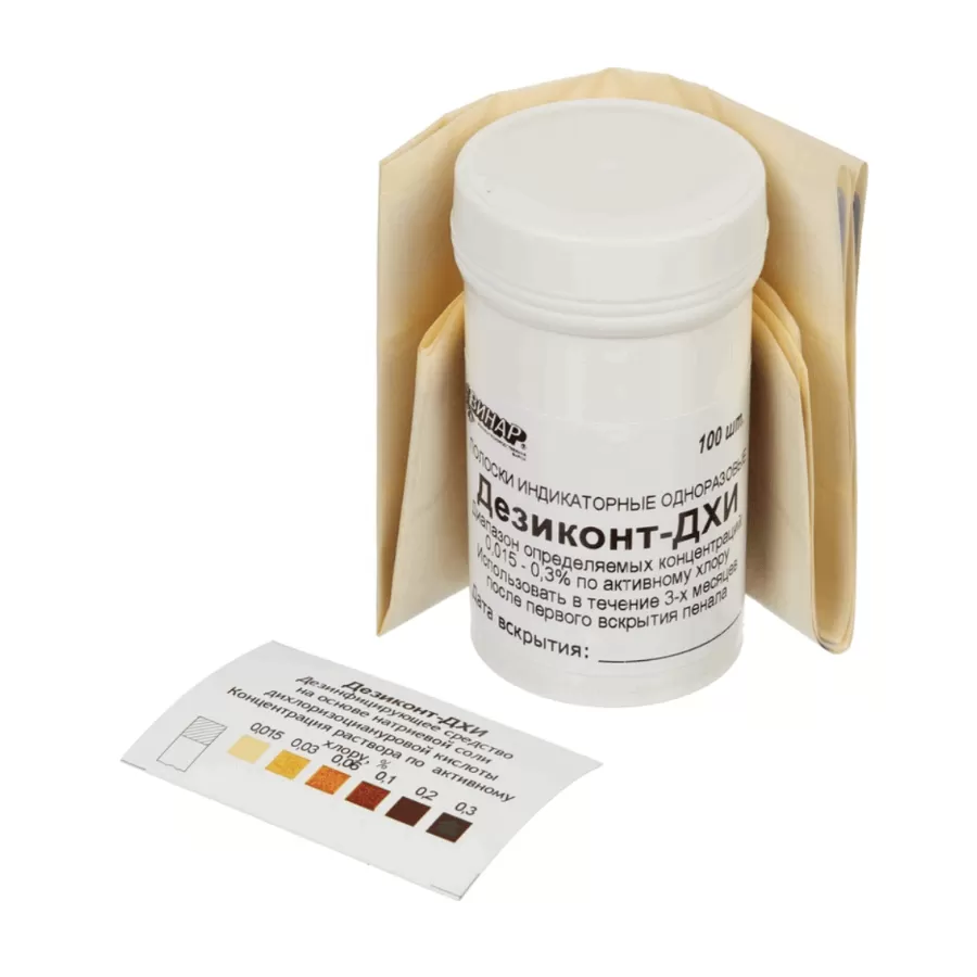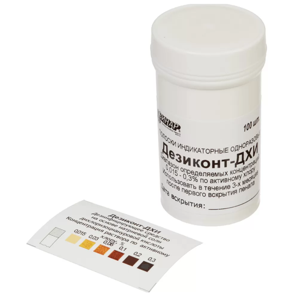 Полоски индикаторные, выпускаемые в соответствии с ТУ 9398-028-11764404-2004, предназначены для визуального контроля концентраций активного хлора в рабочих растворах дезинфицирующих средств на основе натриевой соли дихлоризоциануровой кислоты: Деохлор таблетки, Жавелион, Жавель-Солид, Клорсепт, Клор-Клин, Пюржавель, Санивап и др. с концентрациями 0,015; 0,03; 0,06; 0,1; 0,2; 0,3% по активному хлору.Время контроля не более 3 минут.