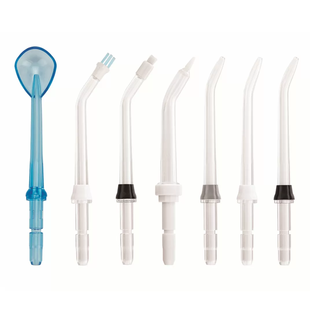 - 7 насадок в комплекте. Стандартные насадки (3 шт.), ортодонтальная для брекетов (1 шт.), пародонтальная с мягким наконечником (1 шт.), насадка для чистки языка (1 шт.) и насадка-щетка для чистки зубов с использованием зубной пасты (1 шт.)