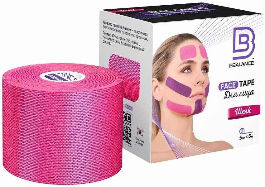 - Шелковый кинезио тейп с мягким клеем шириной 5 см и длиной 5 м. Данного размера рулона хватит на прохождение курса эстетического тейпирования лица (14-21 процедуры).