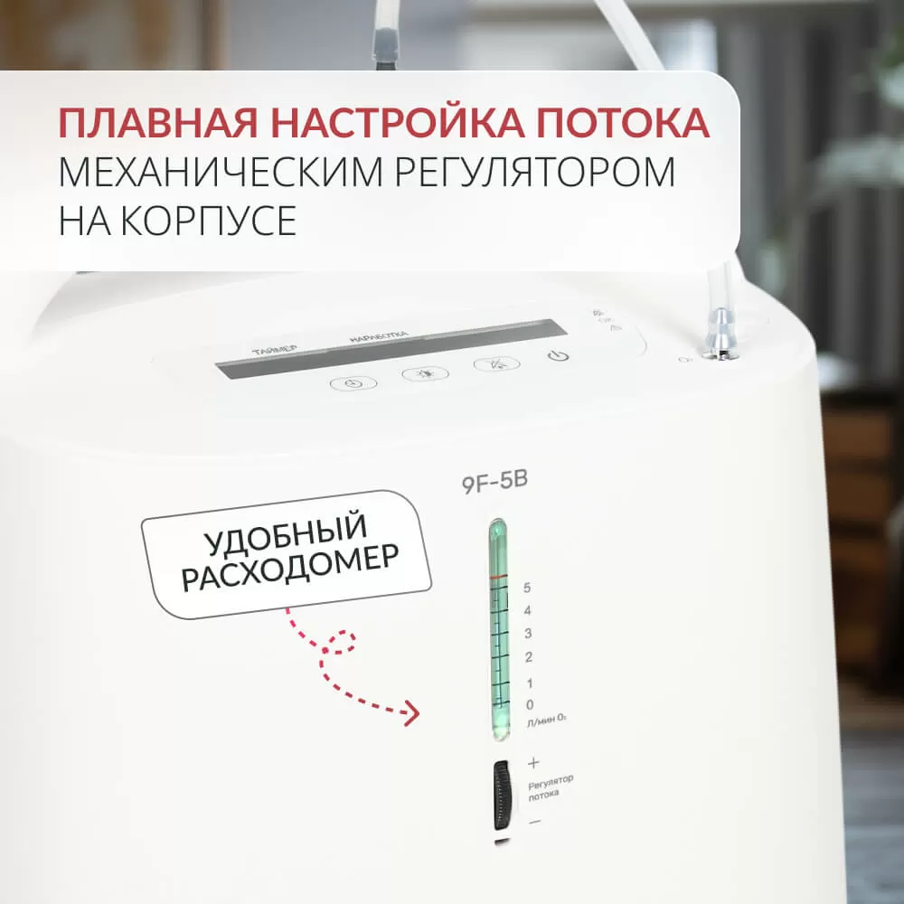 - Производительность. Скорость потока воздушно-кислородной смеси на выходе составляет до 5 л/мин. Такая производительность позволяет проводить регулярную кислородотерапию при различных заболеваниях дыхательной системы. Скорость потока настраивается плавно механическим регулятором на лицевой панели прибора. Для визуального контроля скорости потока на лицевой панели предусмотрен расходомер.