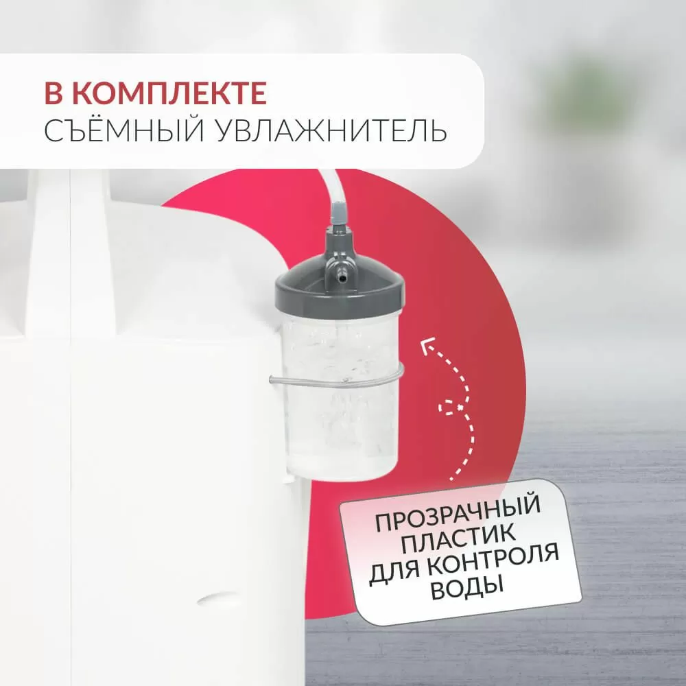 - Продуманная конструкция. Корпус изготовлен из ударопрочного пластика. Для удобства перемещения он оснащён ручкой и манёвренными колёсами, два из которых имеют фиксаторы. На задней поверхности корпуса крепится съёмный увлажнитель. В сочетании с системой фильтрации это обеспечивает подачу пациенту очищенной и увлажнённой кислородно-воздушной смеси, а значит — максимальную пользу от процедуры. Для визуального контроля уровня воды ёмкость увлажнителя изготовлена из прозрачного пластика.