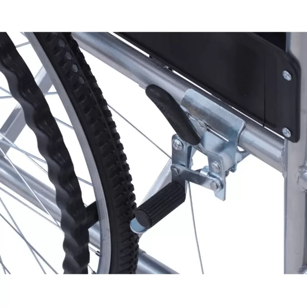 Домашняя кресло-коляска с пневматическими приводными колёсами диаметром 61 см, тормозами для помощника, расположенными на задних рукоятках и туалетным устройством, обеспечивающим полную автономность больного при совершении деликатных процедур.