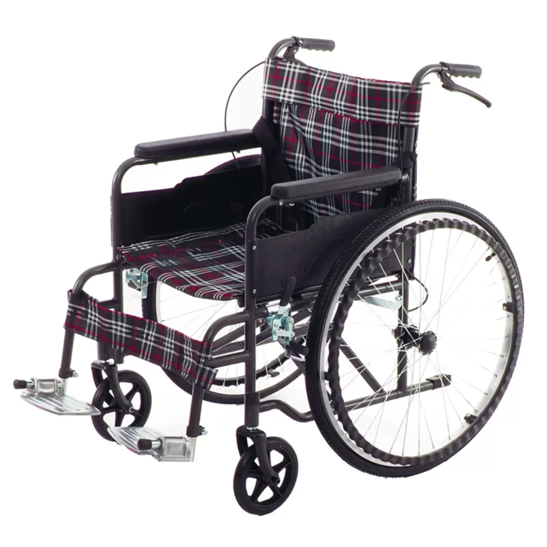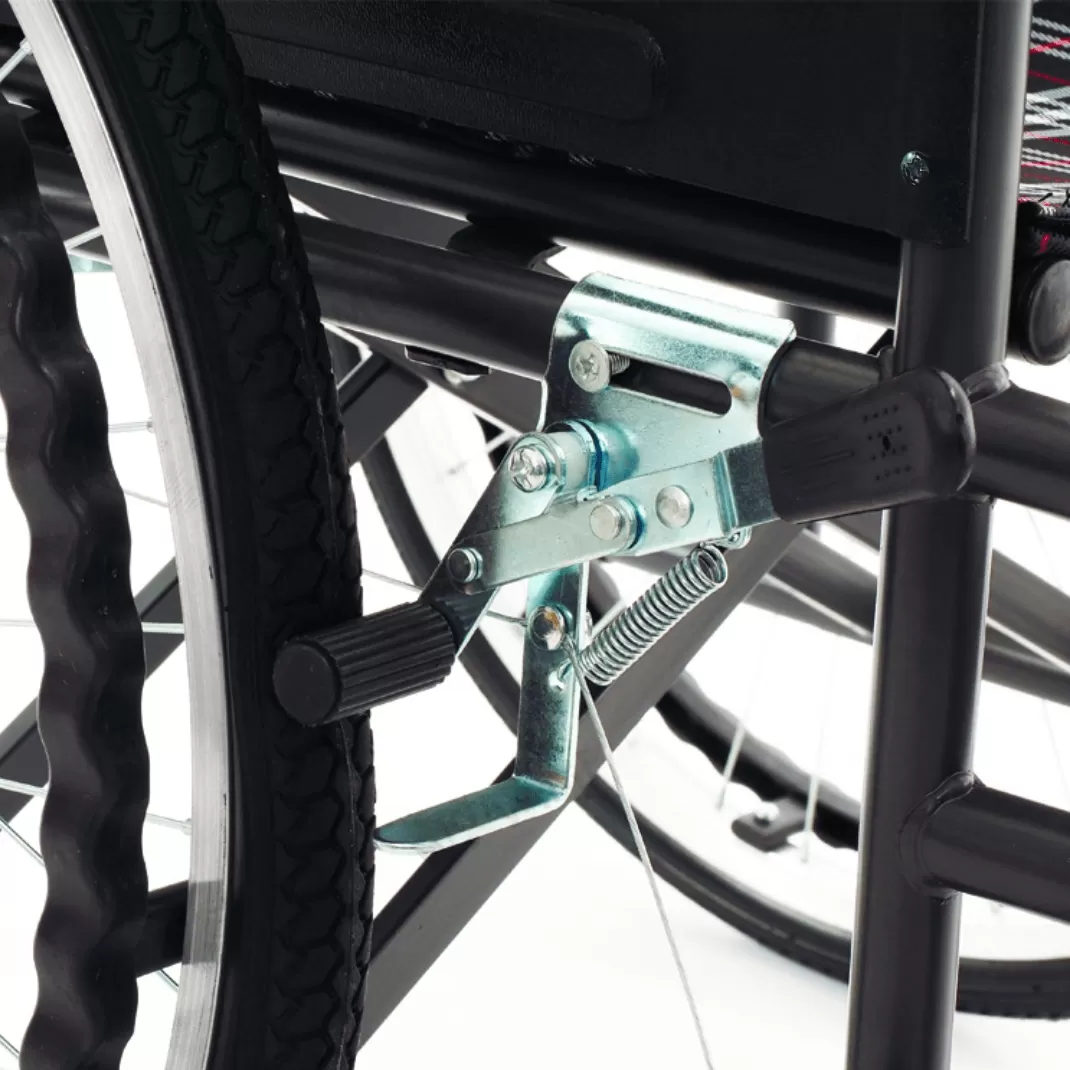 Комфортное сиденье из клетчатого полиэстера с водоотталкивающей пропиткой изнутри, мягкие подлокотники, регулируемые в длине под голень подножки с поднимающимися опорами и рифлёные приводные обода для непривыкших, или ослабленных пациентов.