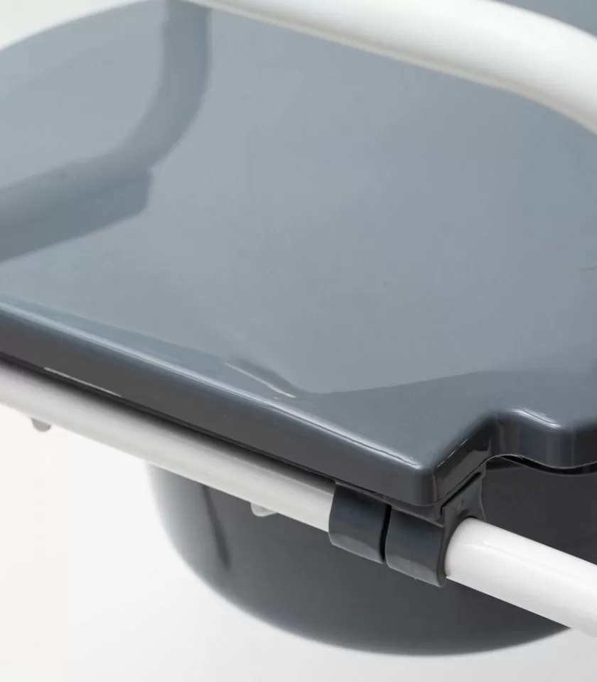 - Модель оснащена съемным ведром с крышкой и пластиковыми подлокотниками.