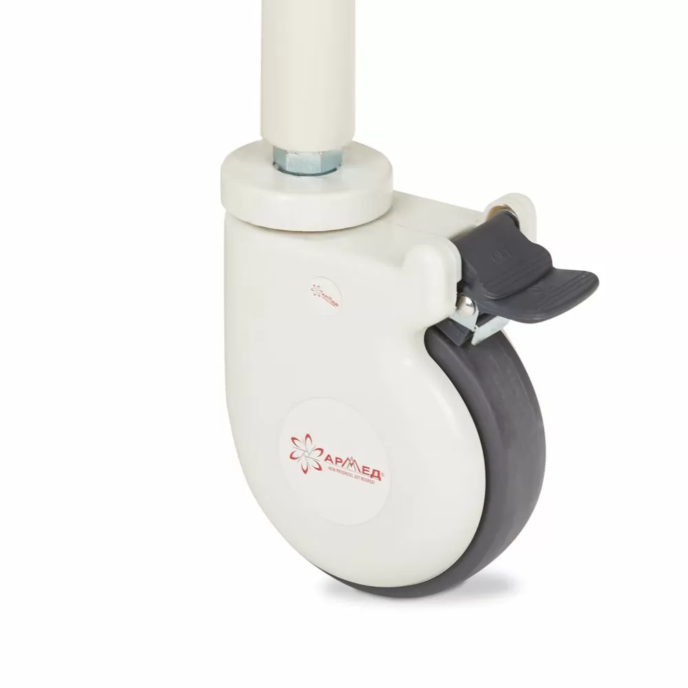 - Конструкция кровати включает четыре прочных маневренных колеса, оснащенных тормозами. Пациента можно легко и безболезненно перевезти в другое помещение и надежно зафиксировать кровать на месте.