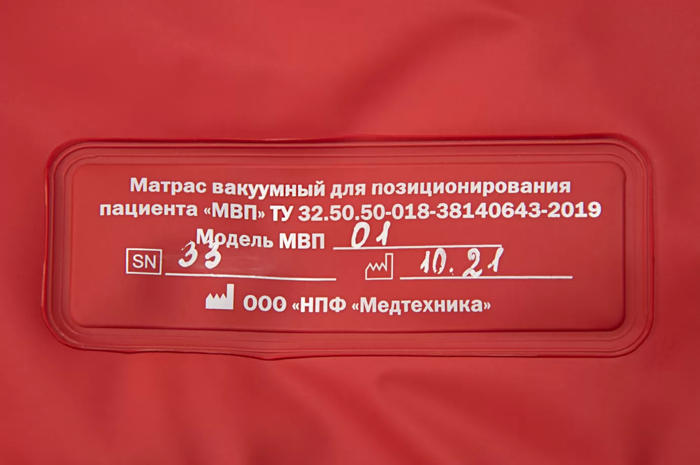 Предназначен для применения при операциях, при диагностических исследованиях, включая аппаратные, при медицинских манипуляциях, при процедурах по уходу, требующих сохранения устойчивого положения тела (его частей) пациента. Матрас, наполненный микрогранулами полистирола, обеспечивает устойчивое положение тела пациента в положении, задаваемое медицинским персоналом, за счёт плотного прилегания поверхности матраса к телу пациента и блокирования его смещения. Микрогранулы полистирола находясь в полиуретановой оболочке матраса образуют жёсткий каркас, охватывающий тело пациента (или части тела) при откачке воздуха из матраса. При длительных процедурах индивидуальная и эргономичная адаптация поверхности матраса к телу пациента позволяет равномерно распределить контактное давление по всему телу. При этом за счёт микрогранул сохраняется микроциркуляция кожного покрова, что уменьшает вероятность появления неврологического синдрома, язв давления и пролежней. Пациент может быть быстро и безопасно закреплён в любом желаемом положении, что обеспечивает персоналу оптимальный доступ к рабочему полю и безопасное обращение с пациентом. Коррекция положения тела пациента может быть выполнена в любое время путём частичного снижения вакуума и затем уточнением позиционирования и фиксацией пациента в новом положении посредством откачки воздуха.