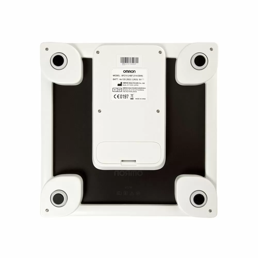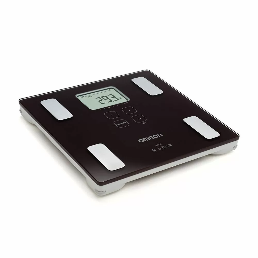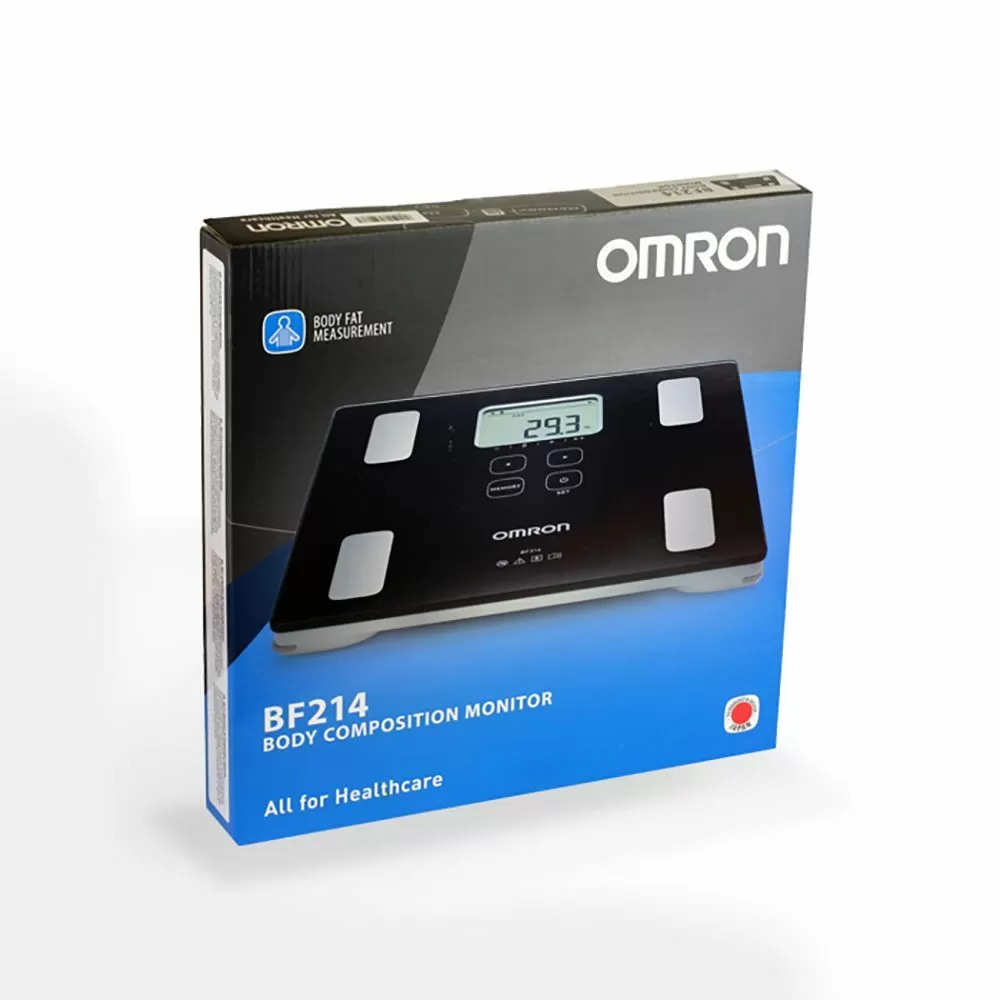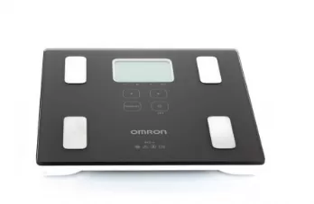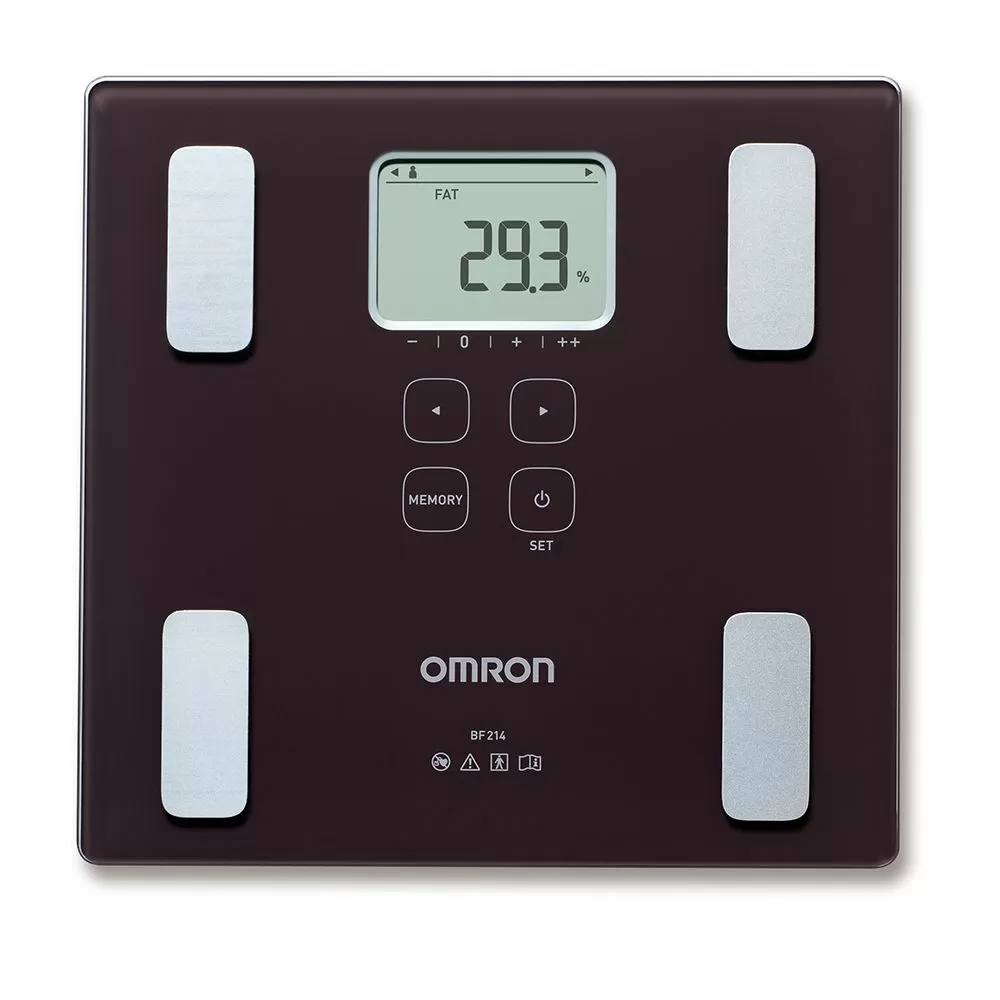 - Определяет общее содержание жира. Прибор измеряет процентное содержание жира в организме методом биоэлектрического импеданса (БИ). Такие ткани организма, как мышцы, кровеносные сосуды и кости, содержат много воды — хорошего проводника электричества. Жир представляет собой ткань, обладающую низкой электропроводностью. Прибор OMRON BF214 пропускает через тело чрезвычайно слабый электрический ток с частотой 50 кГц и силой менее 500 µA, чтобы определить количество жировой ткани. При работе прибора этот слабый электрический ток не ощущается. Чтобы определить по шкале состав тела, прибор OMRON учитывает полное электрическое сопротивление, а также данные о Вашем росте, весе, возрасте и поле, и на основе полученных данных выдает результат о составе тела.
