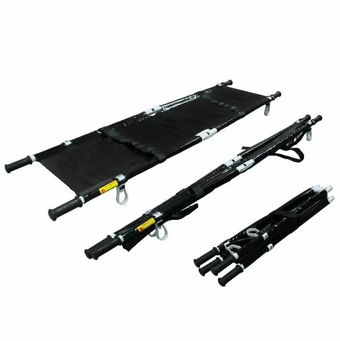 Носилки продольно и поперечно складные НППС-ММ, на жестких опорах, брусья изготовлены из легкого сплава, складываются в продольном и поперечном направлении, ложе из ПВХ ткани (по заказу возможно изготовление из негорючих материалов и полульняной парусины с огнестойкой пропиткой). В сложенном виде возможно размещение в чехле (по заказу) из ПВХ ткани с заплечным ремнем.