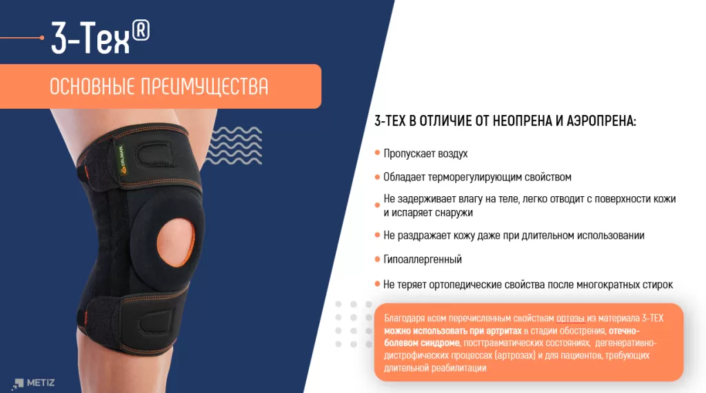 Благодаря всем перечисленным свойствам ортезы из материала 3-ТЕХ можно использовать при артритах в стадии обострения, отечно-болевом синдроме, посттравматических состояниях, дегенеративно-дистрофических процессах (артрозах) и для пациентов, требующих длительной реабилитации.