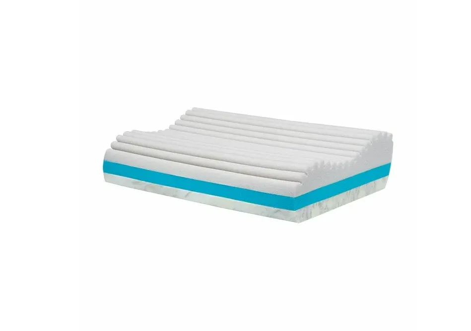 - верхний слой с «эффектом памяти» и валиками различной высоты обеспечивает правильное положение головы и шеи, дарит ощущение невесомости, не препятствует воздухообмену