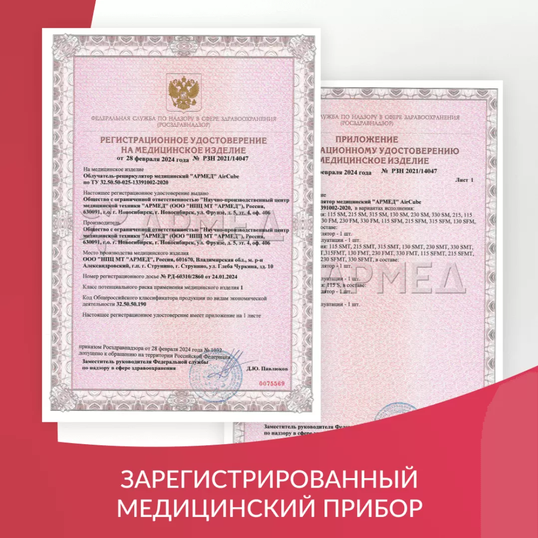 - Гарантия качества. Облучатель-рециркулятор Армед является медицинским прибором и имеет регистрационное удостоверение. В результате ряда научных исследований НИИ Дезинфектологии Роспотребнадзора была доказана эффективность рециркуляторов Армед против бактериальных и вирусных инфекций. Товар имеет маркировку “Честный знак”, подтверждающую его подлинность.