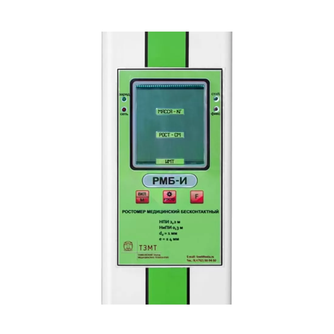 Ростомер медицинский бесконтактный РМБ-И предназначен для измерения роста и вычисления индекса массы тела взрослых и детей в медицинских учреждениях, детских больницах, поликлиниках, центрах педиатрического профиля, домах ребенка, оздоровительных и спортивных учреждениях.Бесконтактный электронный ростомер имеет штангу, основание и ЖК-дисплей размером 70x70 мм со светодиодными индикаторами и клавишами управления.