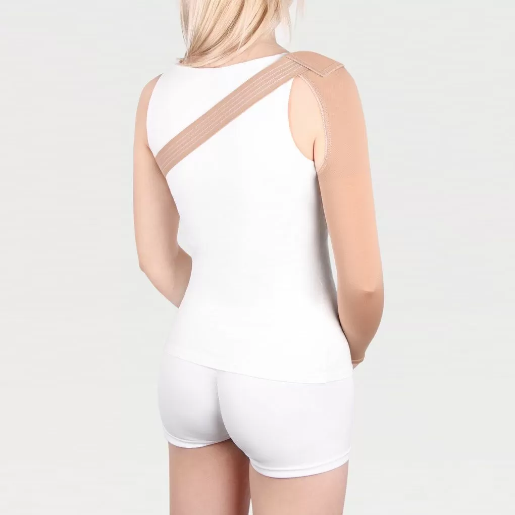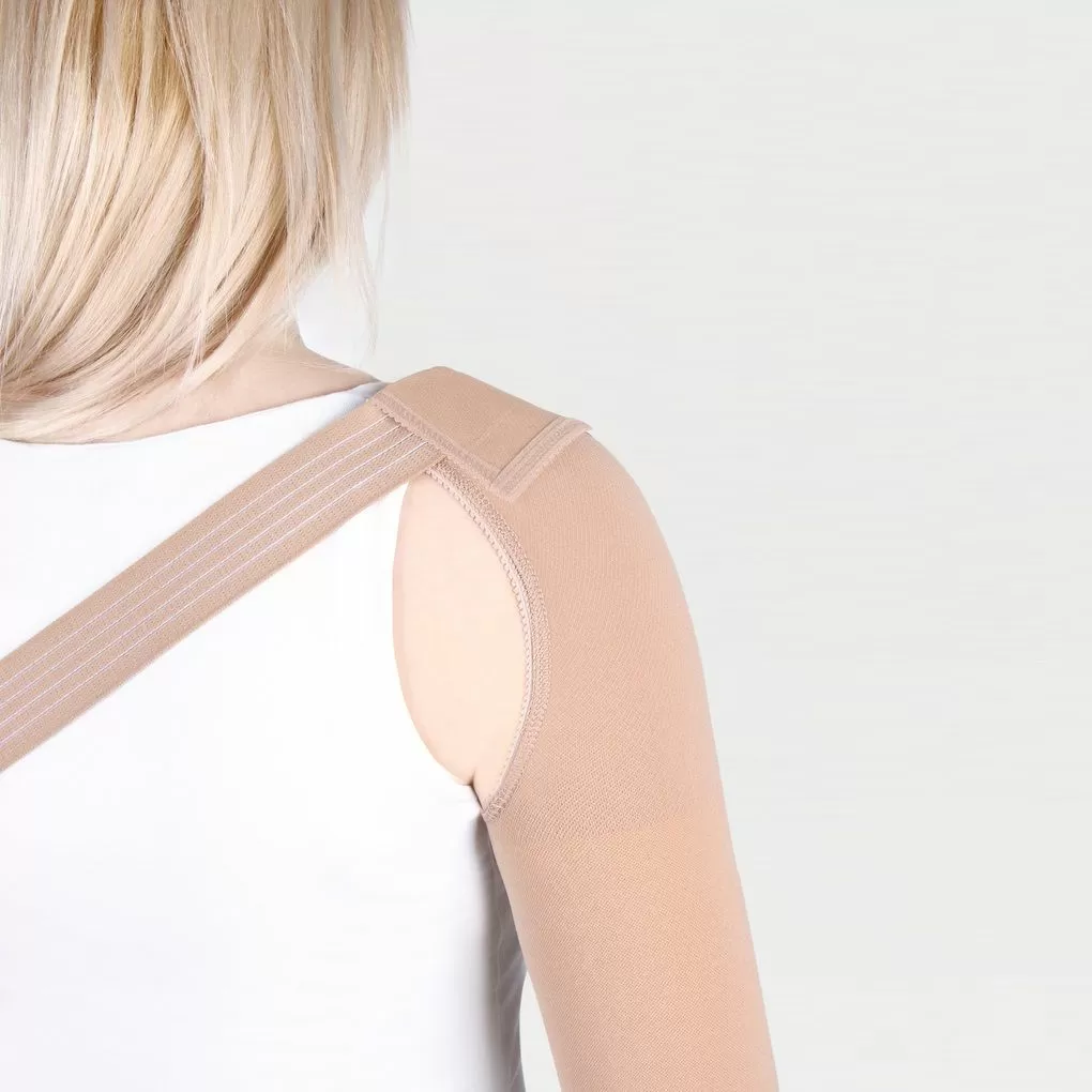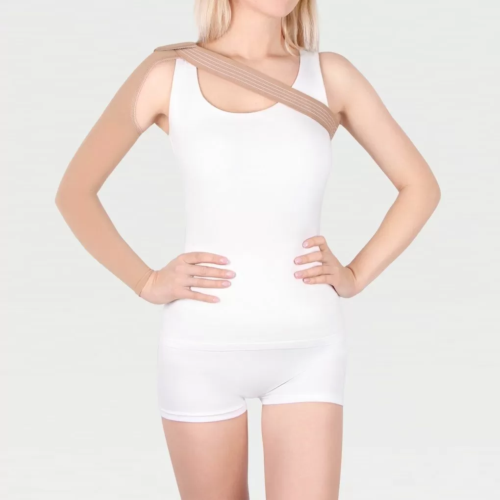 - Держась проблемной рукой за опору, другой рукой постепенно наложите рукав на плечо. Убедитесь в том, что изделие равномерно распределено на руке и не стесняет ее сгибание в локте;