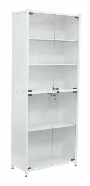- Шкаф имеет два отделения, каждое из которых имеет по две стеклянных двери с замком. В верхнем отделении две металлические полки, в нижнем ― одна.