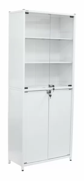 - Шкаф имеет два отделения, каждое из которых имеет по две двери с замком: верх – стекло, низ –металл, полимерно-порошковая краска. В верхнем отделении две металлические полки, в нижнем ― одна.