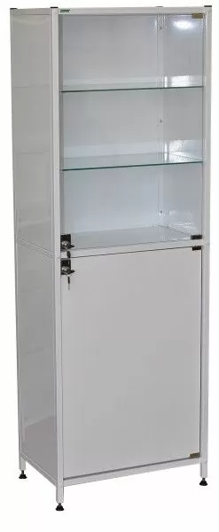 - Шкаф имеет два отделения, каждая из которых имеет дверь с замком, верх-стекло/низ-металл. Полки В верхнем отделении стеклянные, в нижнем ― металические.