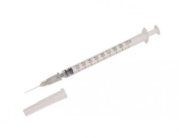 Шприц одноразовый трёхкомпонентный 1 мл, упакованный в блистер. Шприц имеет иглу.