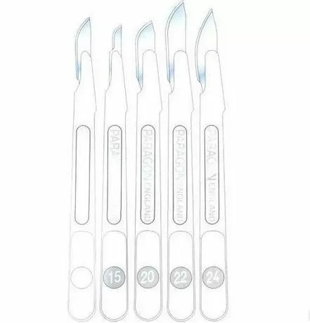 Скальпели поставляются с лезвиями следующих размеров : 10, 11, 12, 15, 20, 21, 22, 23, 24