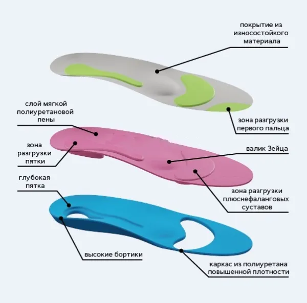- зоны из более мягкого пенополиуретана разгружают области плюснефаланговых суставов, пятку, плантарную фасцию и первый палец стопы