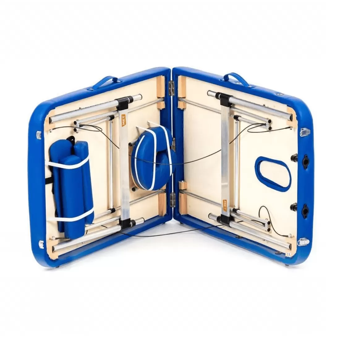 - Массажный стол со складывающийся в чемодан рамой, выполненной из алюминия.