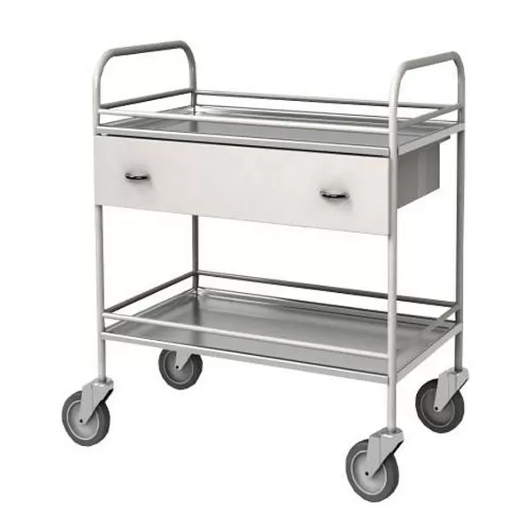 - Каркас столика ― сварная конструкция из нержавеющей стальной трубы, 2 полки с бортиками и 1 выдвижной ящик ― нержавеющий стальной лист