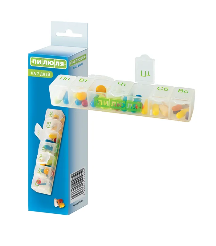 Для таблетированной продукции на семь дней, состоит из 7-ми отделений, которые соответствуют дням недели и режиму приема таблетированной продукции.