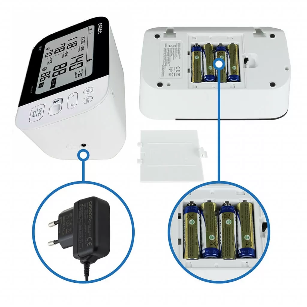 Электронный блок, манжета компрессионная HEM-FL31, адаптер переменного тока HHP-CM01, элементы питания типа «АА», 4 шт., чехол для хранения прибора, руководство по эксплуатации, инструкция по установке приложения, гарантийный талон, журнал для записи артериального давления |