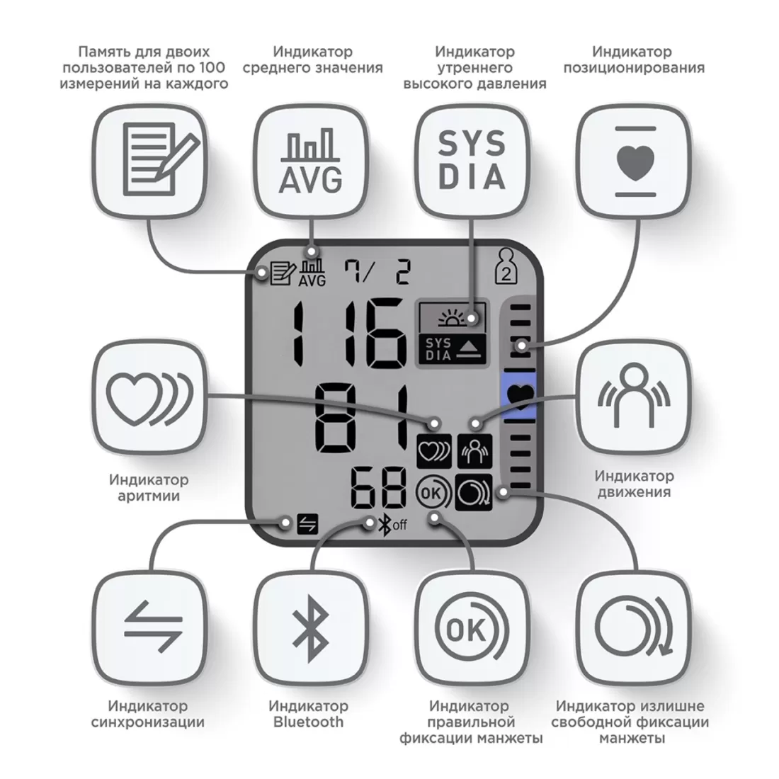 Автоматический тонометр на запястье OMRON RS7 Intelli IT рассчитывает среднее значение на основании трех измерений, произведенных за 10 минут. Если артериальное давление или среднее еженедельное утреннее значение превышают норму, на экране появляются соответствующие значки.Дополнительные функции прибора – распознавание движения во время измерения и нарушения сердечного ритма, позволяют получить более полную картину состояния здоровья.