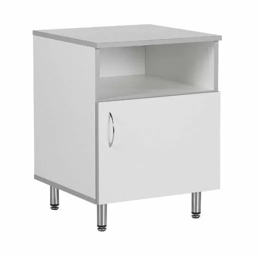 - Тумба установлена на регулируемые по высоте хромированные опоры, глянцевая поверхность которых устойчива к коррозии, позволяет легко производить уборку и дезинфекцию помещений