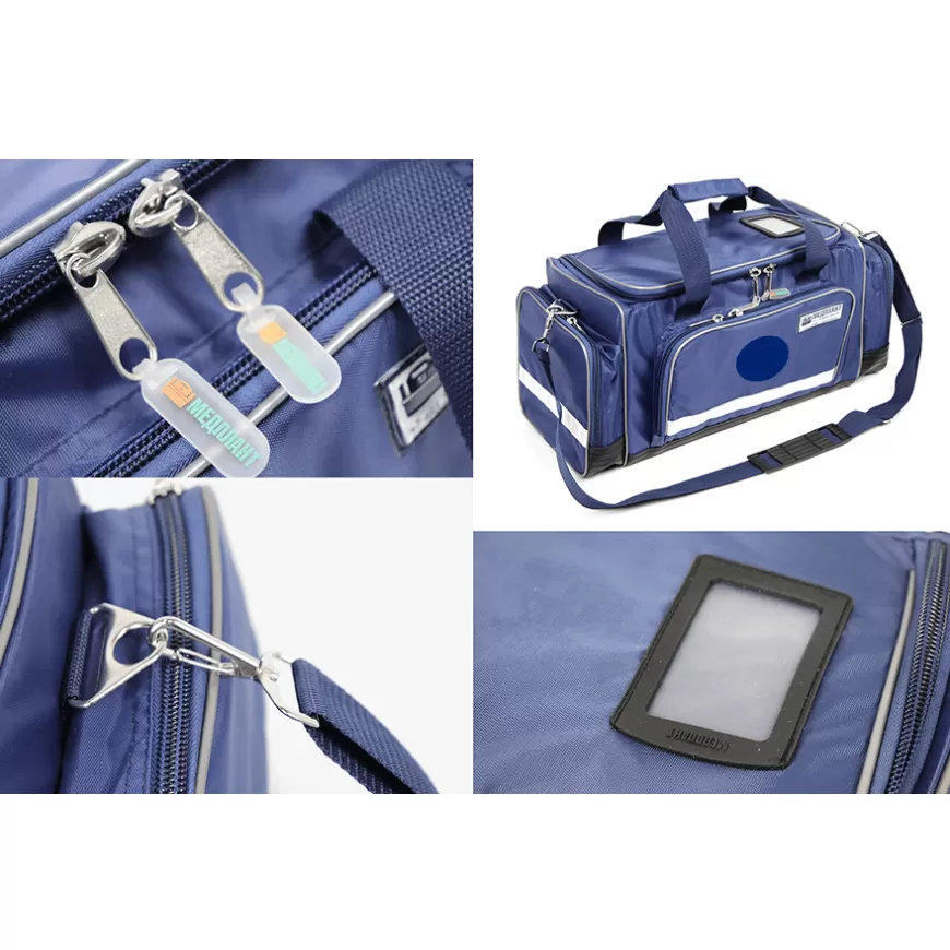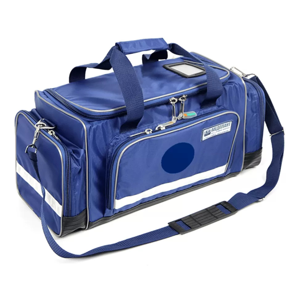 Сумка универсальная СМУ-02. Изготовлена из синтетической водоотталкивающей ткани, дно сумки изготовлено из непромокаемого тентового материала, что обеспечивает хорошую влагоизоляцию сумки. Для защиты вложений от механических повреждений, в стенках сумки находятся моющиеся съёмные каркасные элементы. Для размещения вложений сумка имеет 3 кармана, основной отсек и отсек для хранения документов. На внешней части сумки расположен держатель для информационной таблички (для обозначения номера бригады и т.п.) и специализированной эмблемы сил гражданской обороны. По периметру корпуса сумки расположена светоотражающая полоса для обеспечения безопасности работы в темное время суток. Для удобства переноски сумка снабжена двумя ручками (для ношения одной рукой) и плечевым ремнём, со специальной накладкой, которая предохраняет его от сминания.