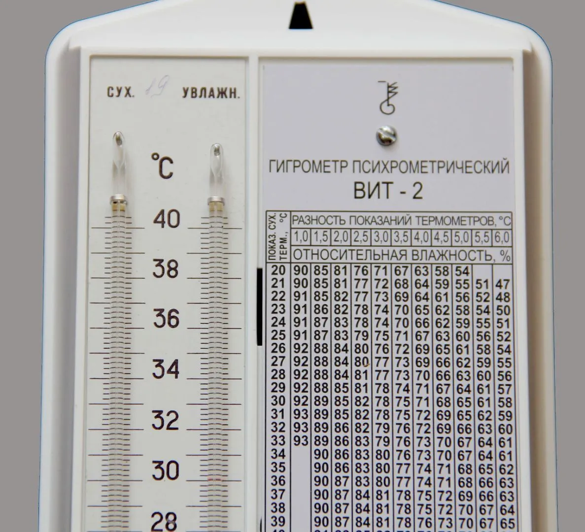 На пластмассовом основании закреплены два термометра, температурная шкала, психрометрическая таблица и стеклянный питатель. Термометрическая жидкость ― толуол.
