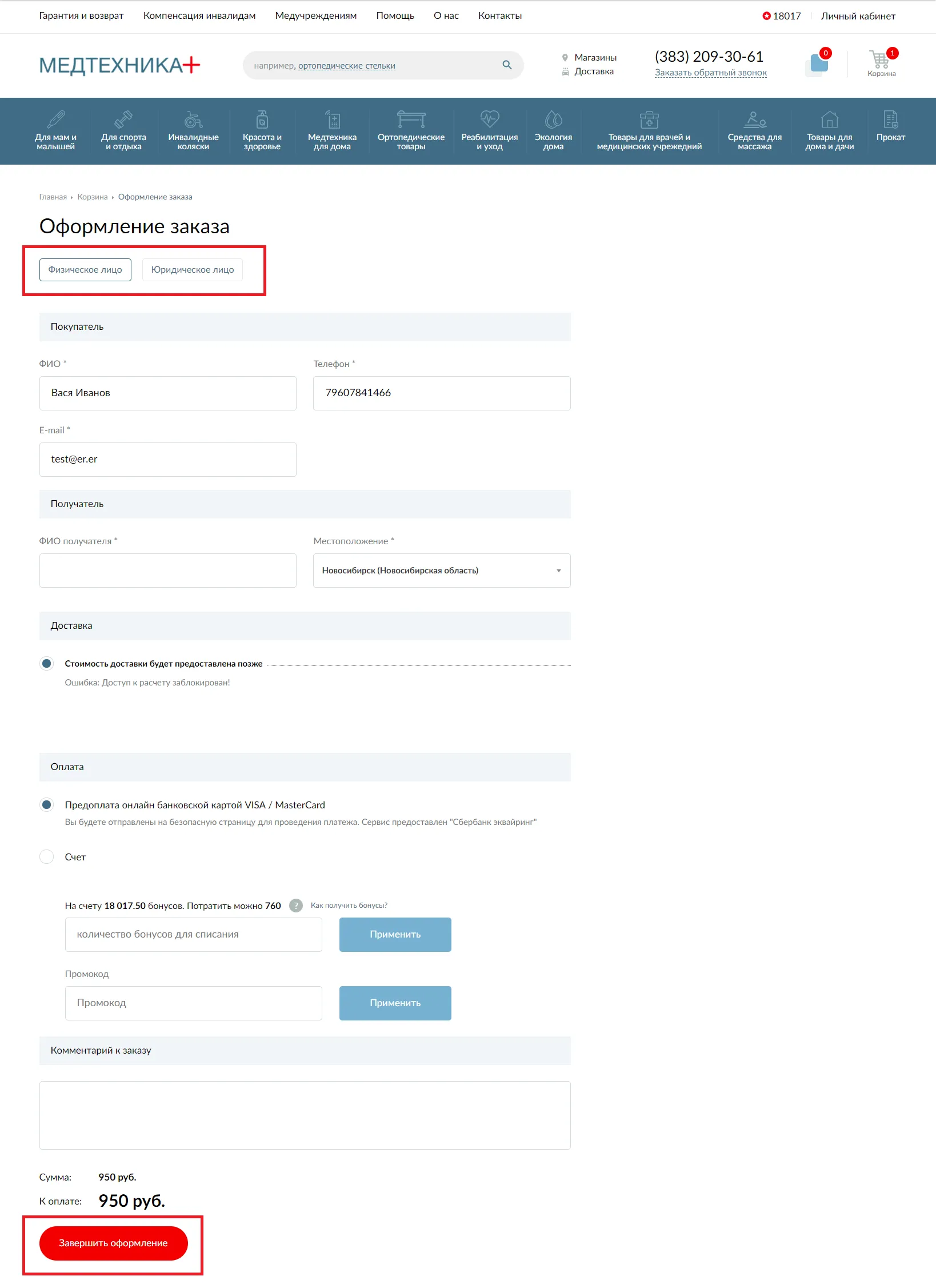 Шаг 4. Оформите заказ: выберите на кого будет происходить оформление (Физическое или Юридическое лицо), после чего заполните контактную информацию, выберите удобный способ доставки и оплаты. Подробнее об условиях доставки и оплаты вы можете прочитать здесь. Пожалуйста, внимательно вводите номер телефона и электронный адрес, чтобы мы смогли согласовать с вами доставку и прислать сообщения об изменениях статуса заказа.